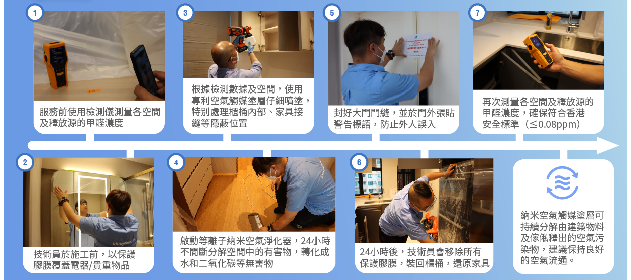 除甲醛空氣淨化服務 讓您裝修後鬆一口氣 安心入住 採用新型納米空氣觸媒技術,無需光線即可持續分解甲醛和苯等揮發性有機化合物(VOCs),高效淨化同時淨味,提升空氣質素,適用於家居、辦公室、醫療機構、學校及商鋪等。 無光源限制可全天候持續分解 避免光源不足二次污染造成致癌物 分解甲醛等VOCs同時淨味 全面治理高度覆蓋家具表層 空氣觸媒劑持專利認證並由第三方機構檢測 適合有孩童及寵物家庭 仔細噴塗專利納米空氣觸媒塗層 進行光等離子空氣淨化 納米空氣觸媒技術的好處 特性 納米空氣觸媒 光觸媒 紫外光 無需 需要 黏附力 強 弱 透明度 透明 奶白色 耐用性 非常耐用 分解變質 服務流程 1) 服務前使用檢測儀測量各空間及釋放源的甲醛濃度 2) 技術員於施工前,以保護膠膜覆蓋電器/貴重物品 3) 根據檢測數據及空間,使用專利空氣觸媒塗層仔細噴塗,特別處理櫃桶內部、家具接縫等隱蔽位置 4) 啟動等離子納米空氣淨化器,24小時不間斷分解空間中的有害物,轉化成水和二氧化碳等無害物 5) 封好大門門縫,並於門外張貼警告標語,防止外人誤入 6) 24小時後,技術員會移除所有保護膠膜,裝回櫃桶,還原家具 7) 再次測量各空間及釋放源的甲醛濃度,確保符合香港安全標準(≤0.08ppm) 納米空氣觸媒塗層可持續分解由建築物料及傢俬釋出的空氣污染物,建議保持良好的空氣流通。 更多問題? 閣下可能對我們其他服務有興趣 :